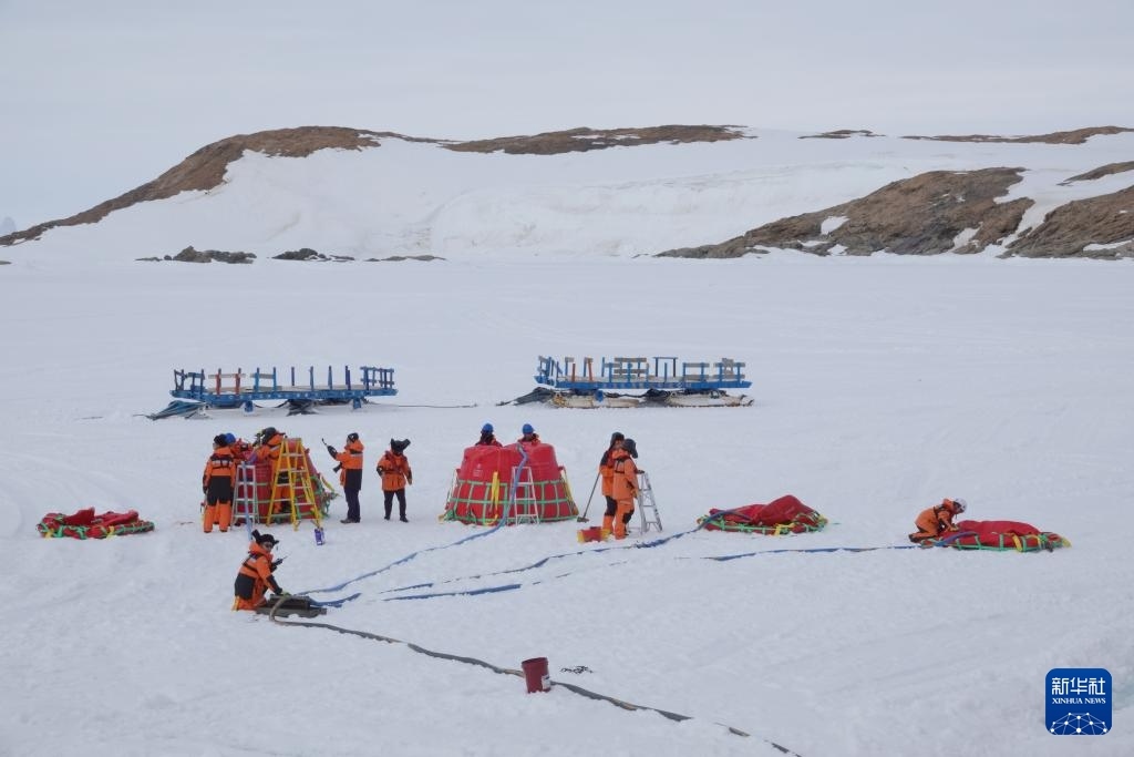 北京時間12月2日傍晚,工作人員在冰面上進(jìn)行油囊加注作業(yè)。新華社記者 顧天成 攝