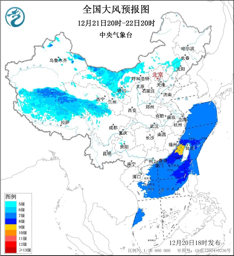 12月21日20時(shí)至22日20時(shí),內(nèi)蒙古中西部、東北地區(qū)南部、華北北部、新疆北疆東部、西藏北部、青海中南部等地有5~6級風(fēng),陣風(fēng)7~9級;東海大部海域、臺灣海峽、臺灣以東洋面、巴士海峽、南海北部和中部海域?qū)⒂?~8級、陣風(fēng)9~10級的大風(fēng),其中臺灣海峽的風(fēng)力可達(dá)9級、陣風(fēng)10~11級。