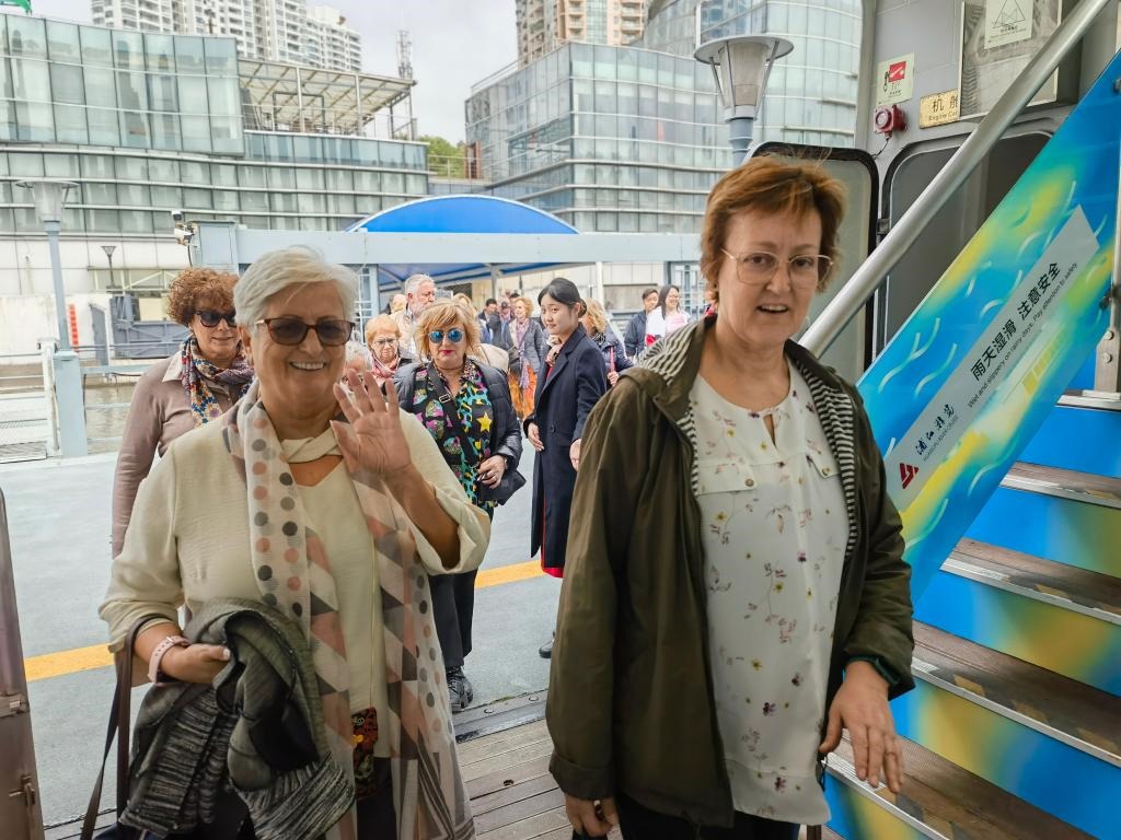 11月5日,來(lái)自西班牙等國(guó)的游客登上黃浦江游船。新華社記者 陳愛(ài)平 攝