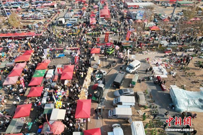 12月8日,山東省臨沂市臨沭縣,民眾暢游曹洼大集。近期,曹洼大集憑借超高性價比的特色美食、濃郁的民俗氛圍、線上線下聯(lián)動的鮮活場景火爆全網(wǎng)。(無人機照片) 中新社記者 王峰 攝