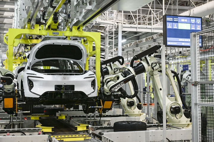 2025年3月6日在位于重慶的長(zhǎng)安汽車數(shù)智工廠總裝車間拍攝的自動(dòng)化生產(chǎn)作業(yè)現(xiàn)場(chǎng)。新華社記者 王全超 攝