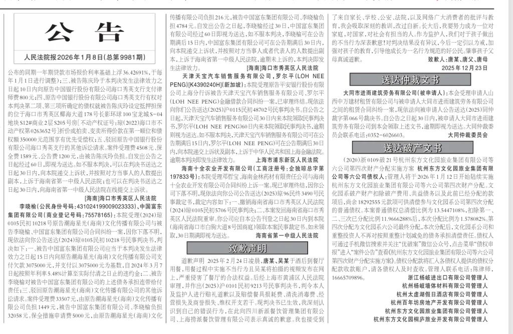 2026年1月8日,《人民法院報》3版刊登了“海底撈小便”當事人唐某及其父母的道歉聲明。