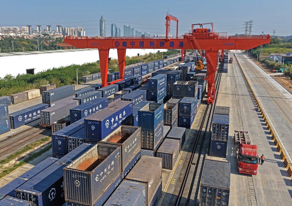 近日,記者從國鐵南寧局獲悉,2025年西部陸海新通道班列發(fā)運集裝箱貨物142.5萬標(biāo)箱,同比增長47.6%,首次實現(xiàn)年發(fā)運量突破百萬標(biāo)箱,再創(chuàng)歷史新高。新華社記者 周華 攝