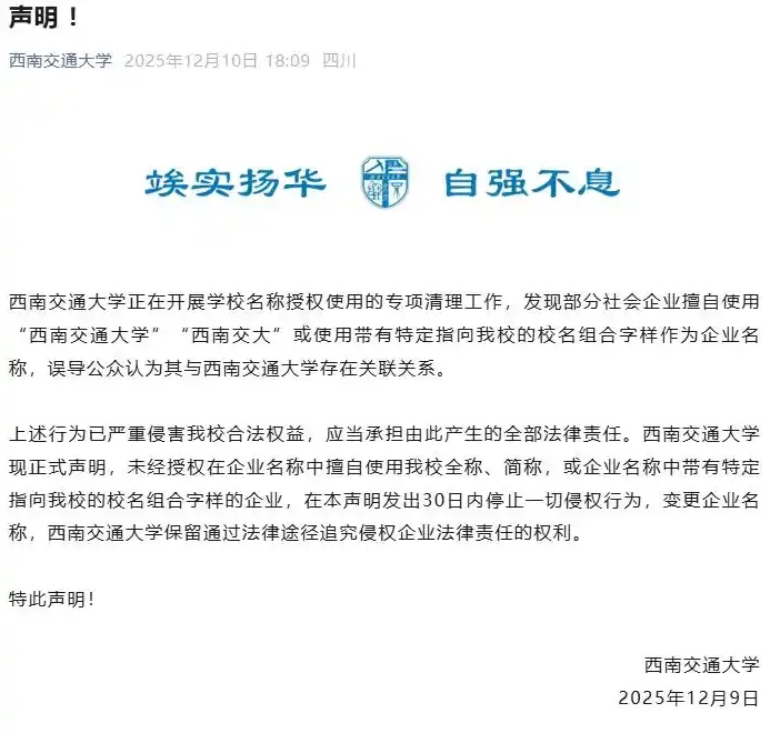 2025年12月10日,西南交通大學(xué)發(fā)表聲明稱,該校正在開(kāi)展學(xué)校名稱授權(quán)使用的專項(xiàng)清理工作,發(fā)現(xiàn)部分社會(huì)企業(yè)擅自使用“西南交通大學(xué)”“西南交大”或使用帶有特定指向該校的校名組合字樣作為企業(yè)名稱,誤導(dǎo)公眾認(rèn)為其與西南交通大學(xué)存在關(guān)聯(lián)關(guān)系。