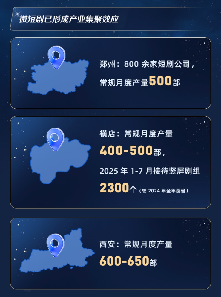 數(shù)據(jù)顯示,全國短劇月度產(chǎn)量已穩(wěn)定在約3000部,并在區(qū)域分工趨勢下,帶動就業(yè)從一線城市向中西部擴(kuò)散。鄭州、西安、橫店等地,正成為這一產(chǎn)業(yè)地理格局的重要支點。