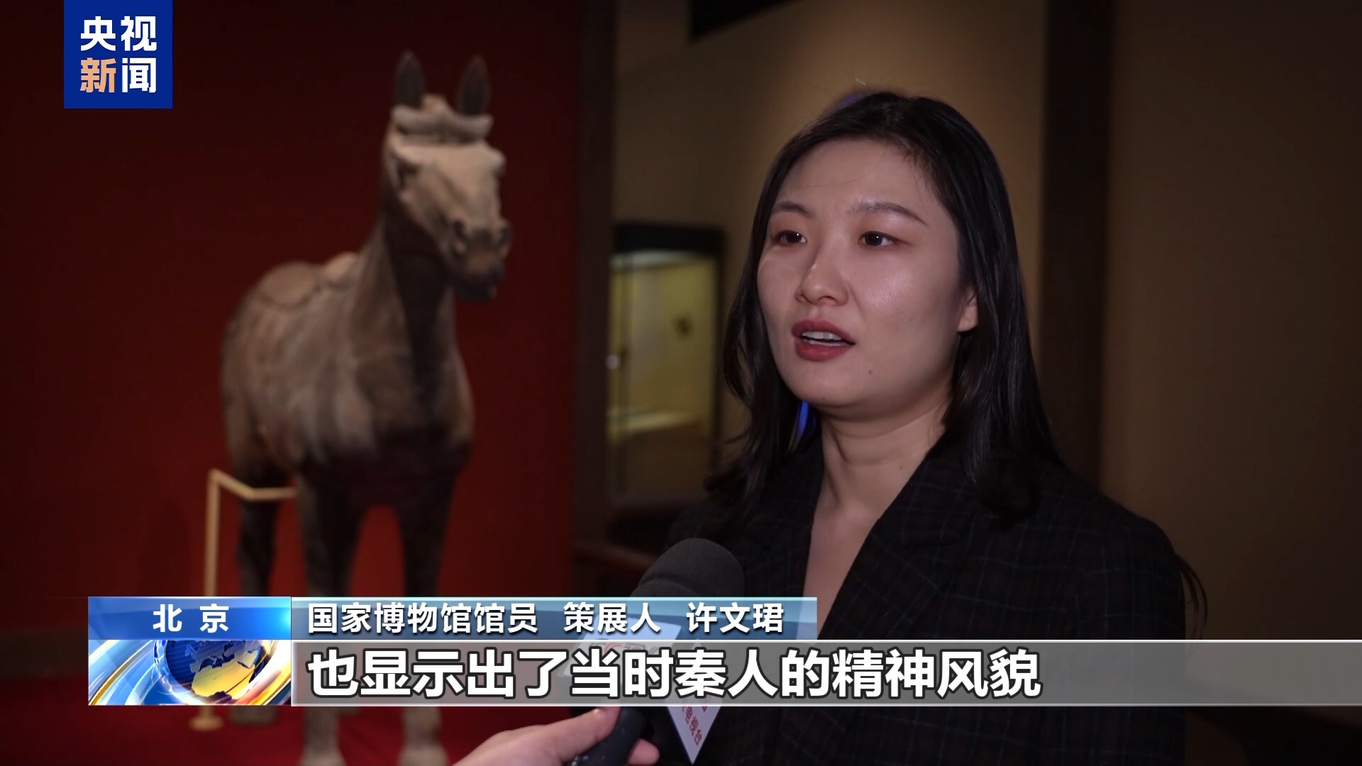 國(guó)家博物館館員、策展人 許文珺:這一件秦始皇帝陵兵馬俑的秦鞍馬,雙蹄直立,它的耳朵是直立的,尾巴也是梳成一個(gè)辮狀,整體非常有力量,也是秦代人對(duì)戰(zhàn)馬篩選標(biāo)準(zhǔn)非常嚴(yán)格的體現(xiàn),也顯示出了當(dāng)時(shí)秦人的一個(gè)精神風(fēng)貌。