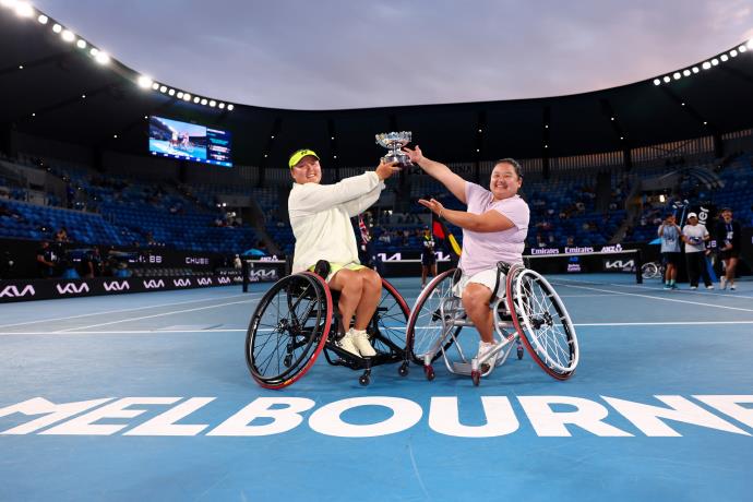 北京時(shí)間1月30日,2026澳網(wǎng)輪椅網(wǎng)球女雙決賽,頭號種子、中國組合王紫瑩/李曉輝以6-4、6-3擊敗2號種子朱珍珍/上地結(jié)衣,實(shí)現(xiàn)衛(wèi)冕。中國選手朱珍珍和搭檔上地結(jié)衣收獲亞軍。