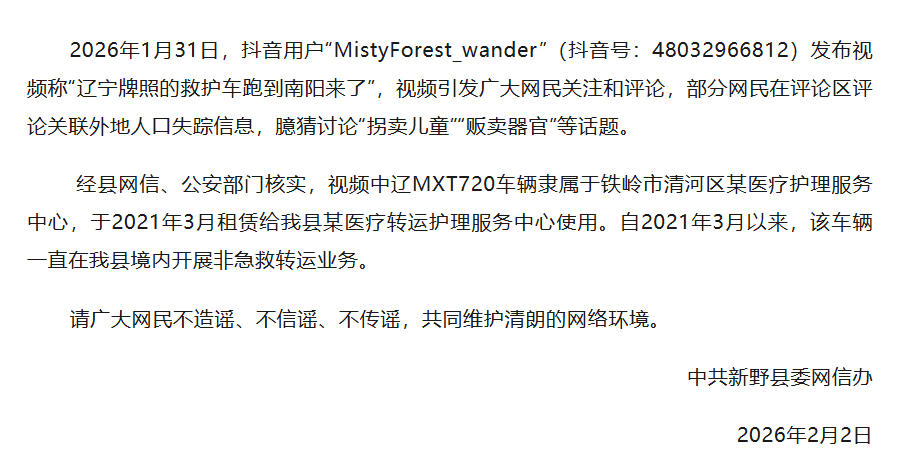 中國(guó)網(wǎng)2月2日訊 據(jù)“新野發(fā)布”微信公眾號(hào)消息,2月2日上午,河南省南陽(yáng)市新野縣委網(wǎng)信辦發(fā)布情況說(shuō)明稱(chēng),2026年1月31日,抖音用戶(hù)“MistyForest_wander”(抖音號(hào):48032966812)發(fā)布視頻稱(chēng)“遼寧牌照的救護(hù)車(chē)跑到南陽(yáng)來(lái)了”,視頻引發(fā)廣大網(wǎng)民關(guān)注和評(píng)論,部分網(wǎng)民在評(píng)論區(qū)評(píng)論關(guān)聯(lián)外地人口失蹤信息,臆猜討論“拐賣(mài)兒童”“販賣(mài)器官”等話(huà)題。