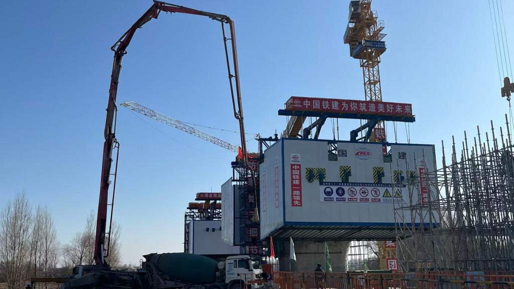 在中鐵二十一局集團(tuán)有限公司施工現(xiàn)場(chǎng),架橋機(jī)正在作業(yè)。(馬辰 攝)