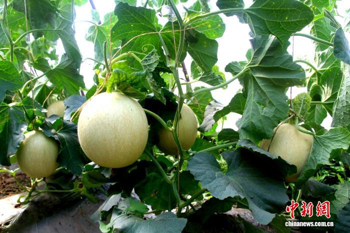 圖為原本伏地生長的臺(tái)灣“玉菇”甜瓜,落戶民勤變成了吊瓜。馬愛彬 攝