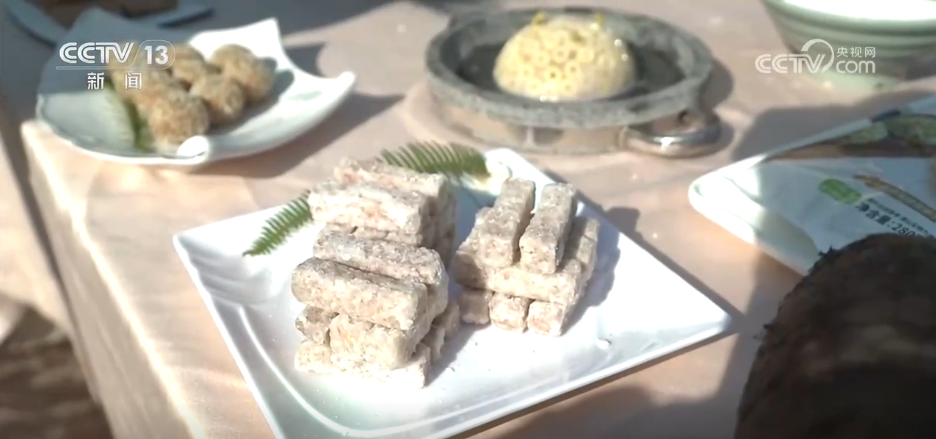 除了好看,當(dāng)然也有好吃的。當(dāng)?shù)氐募t糖年糕寓意著“年年高、步步高”。還有一道是用本地檳榔芋做成的掛霜芋,將芋塊加入白糖翻炒,表面裹上一層細(xì)細(xì)的糖霜,粉粉糯糯,是每家每戶(hù)逢年過(guò)節(jié)的必備菜肴。