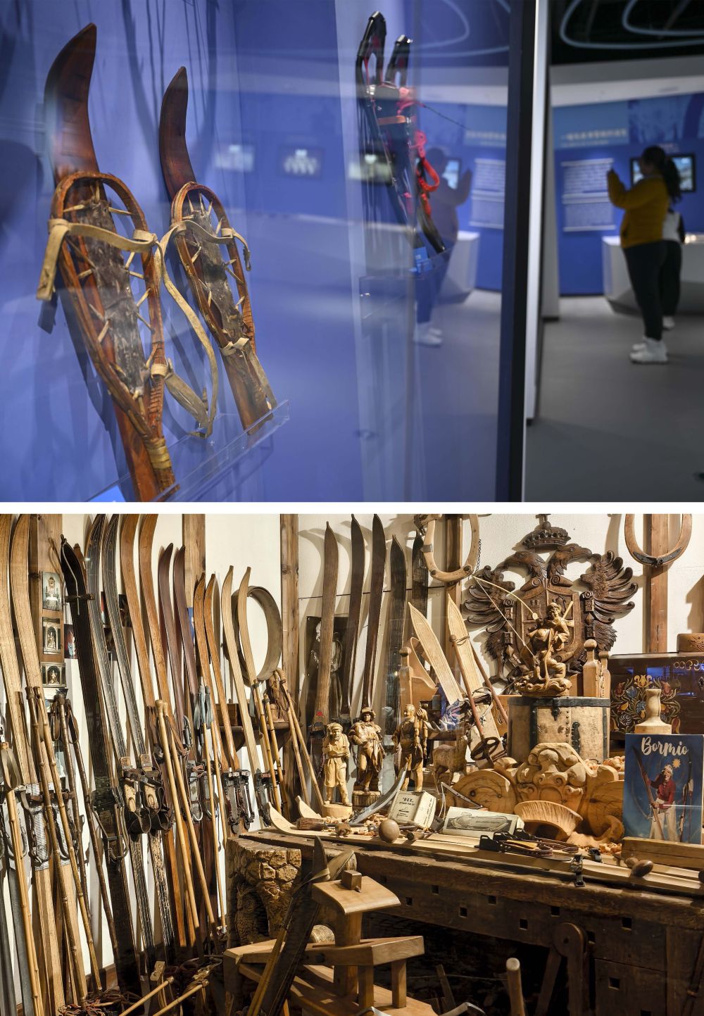 拼版照片:上圖為游客在中國(guó)新疆阿勒泰人類滑雪起源地博物館參觀(2025年1月24日攝)。下圖為在意大利博爾米奧拍攝的一家展示老式滑雪板的門店(2026年2月5日攝)。均為新華社記者 胡虎虎 攝