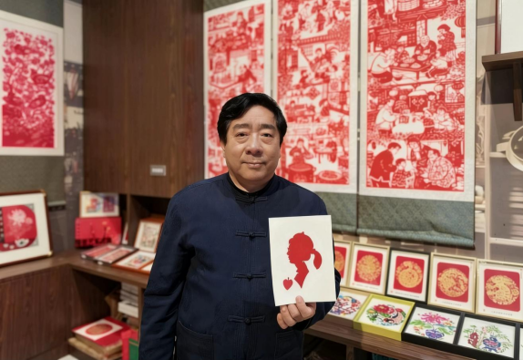 工坊中央,克樹利被層層觀眾圍住,叫好聲此起彼伏。只見他手持一張巴掌大的紅紙,目光在人群中一掃,隨手拉住前排一位扎馬尾辮的小姑娘,手上的剪刀便如游龍般翻飛起來。不畫底稿、不做標記,紅紙在他手中旋轉變形,幾十秒的工夫,一把剪刀開合之間,一張惟妙惟肖的人影剪紙便已成型——俏皮的馬尾辮、抿著嘴的笑臉,甚至連小姑娘頭頂上的發(fā)卡都清晰可見。“像!太像了!”圍觀人群中爆發(fā)出一陣熱烈的掌聲,小姑娘捧著剪紙,喜笑顏開。