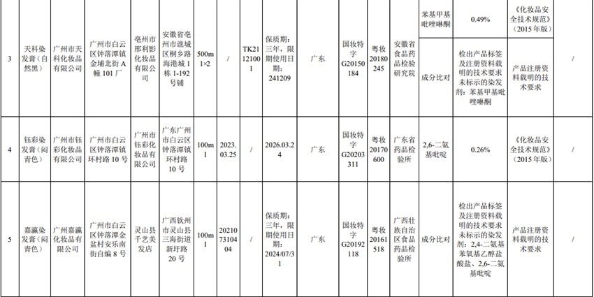 人民網(wǎng)北京9月5日電 (記者孫紅麗)國家藥監(jiān)局近日發(fā)布通告,在2023年國家化妝品抽樣檢驗工作中,經(jīng)重慶市食品藥品檢驗檢測研究院等單位檢驗,產(chǎn)品標(biāo)簽標(biāo)示為廣州市天科化妝品有限公司生產(chǎn)的天科染發(fā)膏(自然黑)等23批次化妝品不符合規(guī)定。