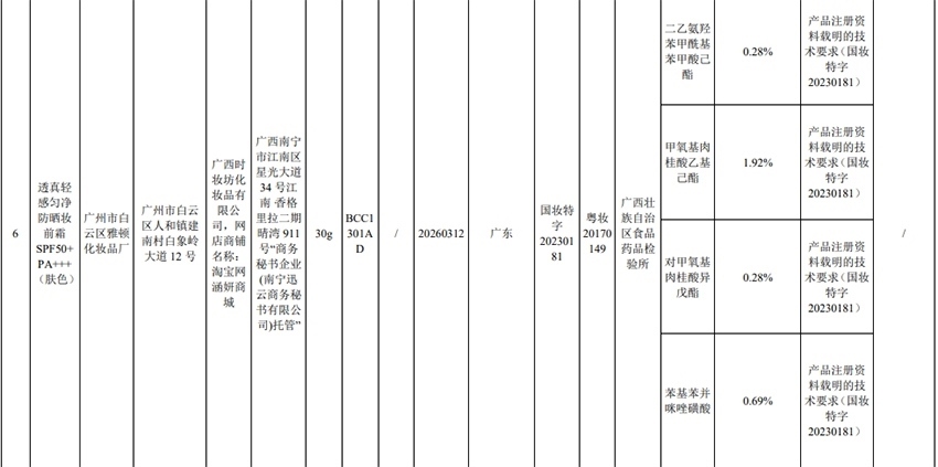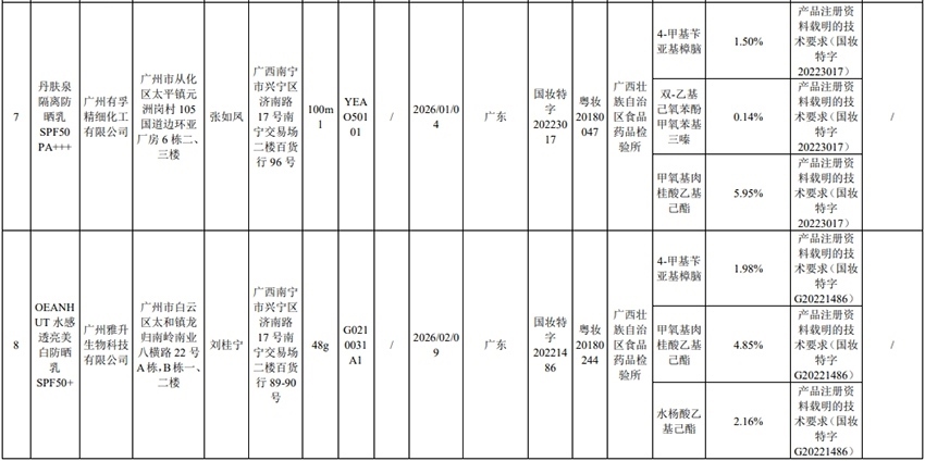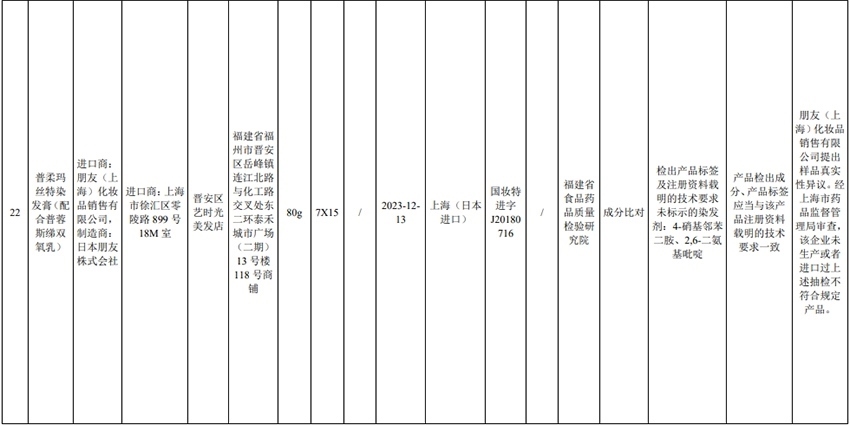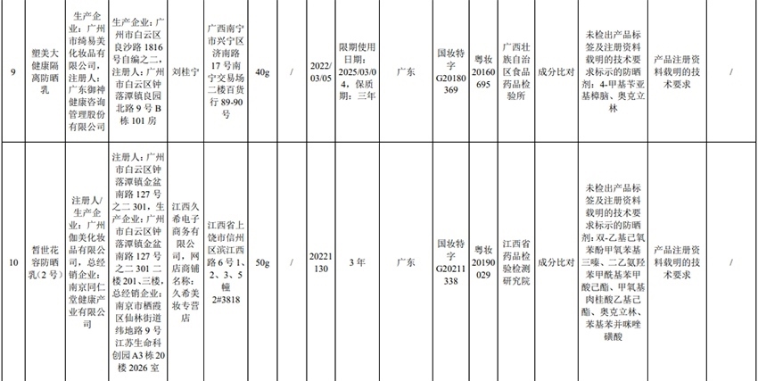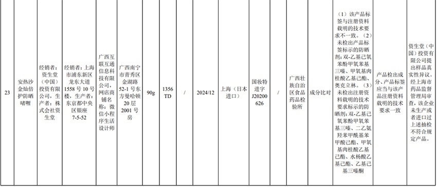 記者注意到,其中,產(chǎn)品標(biāo)簽標(biāo)示為歐萊雅(中國)有限公司生產(chǎn)的蘭蔻輕透水漾防曬乳(標(biāo)示批號:78W200)“未檢出產(chǎn)品標(biāo)簽及注冊資料載明的技術(shù)要求標(biāo)示的防曬劑”;產(chǎn)品標(biāo)簽標(biāo)示為朋友(上海)化妝品銷售有限公司進口的普柔瑪絲特染發(fā)膏(配合普蓉斯綈雙氧乳)(標(biāo)示批號:7X15)“檢出產(chǎn)品標(biāo)簽及注冊資料載明的技術(shù)要求未標(biāo)示的染發(fā)劑”;產(chǎn)品標(biāo)簽標(biāo)示為資生堂(中國)投資有限公司經(jīng)銷的安熱沙金燦倍護防曬啫喱(標(biāo)示批號:1356TD)“產(chǎn)品標(biāo)簽與注冊資料載明的技術(shù)要求不一致”、“未檢出產(chǎn)品標(biāo)簽標(biāo)示的防曬劑”、“未檢出注冊資料載明的技術(shù)要求標(biāo)示的防曬劑”。
