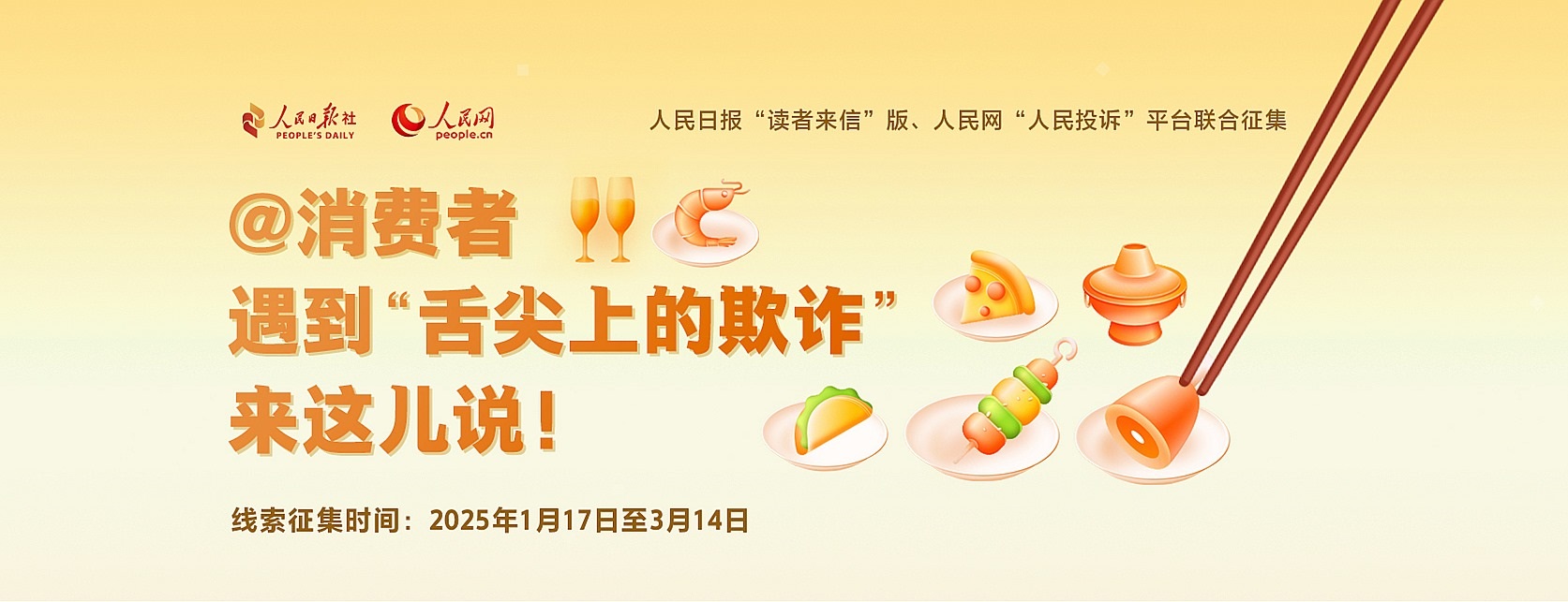 牛肉干里不含牛肉,無(wú)糖產(chǎn)品其實(shí)含糖,配料表造假、營(yíng)養(yǎng)成分表不準(zhǔn)確……你遇到過(guò)嗎?“以假亂真”“以次充好”為代表的食品欺詐,嚴(yán)重?fù)p害消費(fèi)者利益,擾亂市場(chǎng)公平競(jìng)爭(zhēng)秩序。為筑牢食品安全防線,增強(qiáng)消費(fèi)者信心,即日起,人民日?qǐng)?bào)“讀者來(lái)信”版與人民網(wǎng)“人民投訴”平臺(tái)聯(lián)合發(fā)起相關(guān)線索征集,歡迎您掃描上方海報(bào)二維碼進(jìn)入征集頁(yè)面留言或提供調(diào)查線索至人民日?qǐng)?bào)“讀者來(lái)信”版(郵箱:dzlx@peopledaily.cn 傳真:010-65368495)。線索征集時(shí)間截至2025年3月14日。
