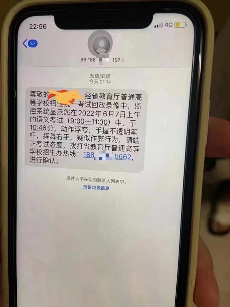 “尊敬的考生×××,經(jīng)省教育廳普通高等學(xué)校招生統(tǒng)一考試回放錄像中,監(jiān)控系統(tǒng)顯示您在2022年6月7日上午的語(yǔ)文考試(9:00—11:30)中,于10時(shí)46分,動(dòng)作浮夸,手握不透明筆桿,揮舞右手,疑似作弊行為,請(qǐng)端正考試態(tài)度,撥打省教育廳普通高等學(xué)校招生辦熱線:188×××進(jìn)行確認(rèn)?!苯?,有考生向廈門警方反映,自己接到了聲稱是“省教育廳普通高等學(xué)校招生辦”的通知短信,懷疑是詐騙信息。該短信在開(kāi)頭準(zhǔn)確寫(xiě)明了考生姓名,并在結(jié)尾要求考生主動(dòng)撥電話號(hào)碼進(jìn)行確認(rèn)。經(jīng)與教育部門核實(shí)確認(rèn),高考作弊違規(guī)行為不會(huì)以短信、電話、鏈接等方式通知。廈門警方提醒,不法分子通過(guò)非正常渠道搜集到考生信息,并向考生發(fā)送所謂“疑似作弊”的通知短信,考生一旦回?fù)茈娫?,就可能被不法分子以“處理作弊行為”為由?shí)施詐騙?! ?/p>