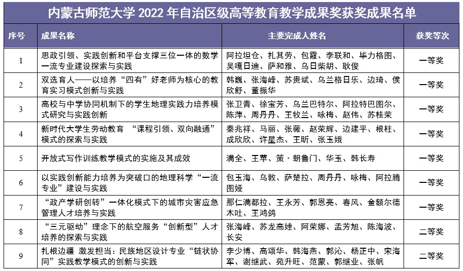 北疆新聞網(wǎng)、北疆新聞APP、北疆云消息(記者 李艷紅)近日,內(nèi)蒙古自治區(qū)教育廳發(fā)布了《關(guān)于公布2022年自治區(qū)級高等教育教學成果獎獲獎成果的通知》,內(nèi)蒙古師范大學微官網(wǎng)由數(shù)學科學學院牽頭、黨委書記阿拉坦倉主持的《思政引領(lǐng)、實踐創(chuàng)新和平臺支撐三位一體的數(shù)學一流專業(yè)建設(shè)與實踐》等17個推薦至自治區(qū)的教學成果均獲獎,實現(xiàn)了100%的獲獎率。其中,一等獎7項,二等獎4項,三等獎6項。一等獎獲獎數(shù)量及總獲獎率位居全區(qū)之首。