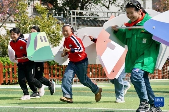 3月31日,徐州市漢橋小學(xué)的學(xué)生進(jìn)行“列車競(jìng)速”游戲。