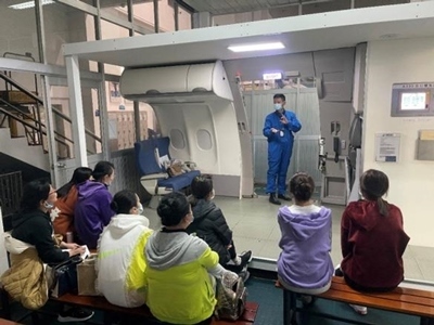 航空企業(yè)在實訓基地組織實施空乘專業(yè)教師培訓項目,此為參訓教師學習正常與緊急情況開關艙門的要領、機上應急設備