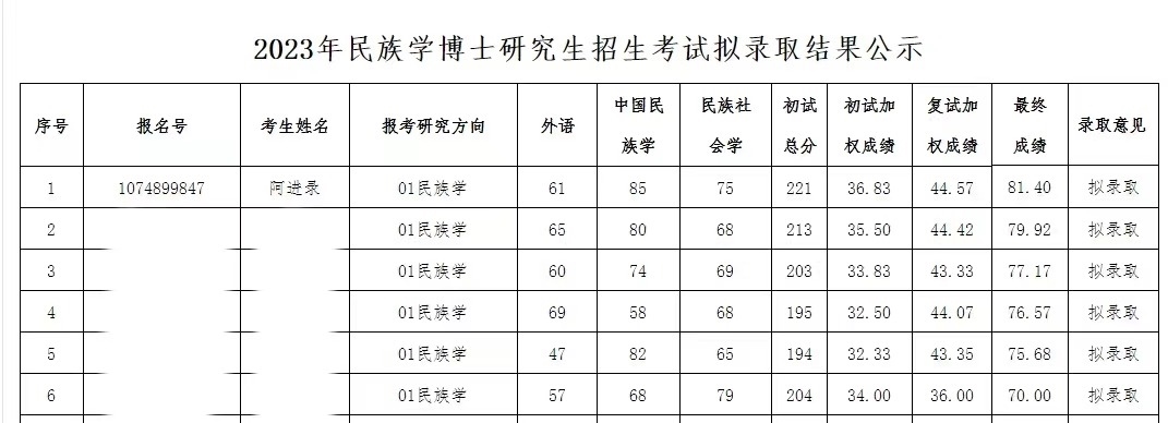 記者了解到,4月9日,青海民族大學(xué)研究生院官方網(wǎng)站發(fā)布《青海民族大學(xué)2023年民族學(xué)博士研究生招生考試擬錄取結(jié)果公示》。該公示稱,經(jīng)2023年青海民族大學(xué)博士招生工作領(lǐng)導(dǎo)小組審議通過,擬錄取17位考生為民族學(xué)博士研究生。根據(jù)公示,考生阿進(jìn)錄以最終成績(jī)81.40分進(jìn)入擬錄取名單,在民族學(xué)(報(bào)考研究方向)擬錄取的6名考生中排名第一。(李依環(huán)、實(shí)習(xí)生遇鏡霖)