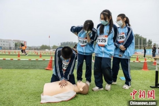 在“紅氣球校園挑戰(zhàn)賽”上,學(xué)生參與完成骨折固定、海姆立克急救法、心肺復(fù)蘇等技能操作 中國紅基會 供圖