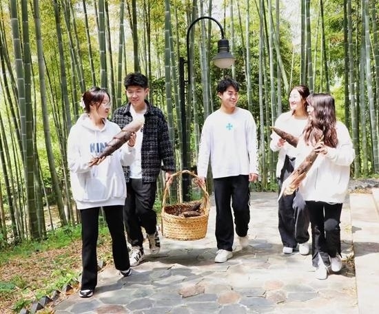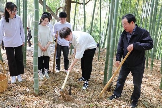 進(jìn)行40分鐘的“漫談式”課程后,師生們一起拿起鋤頭,開始挖筍實(shí)踐。在勞動中,他們感受著春天的饋贈。該校視覺傳達(dá)與設(shè)計(jì)專業(yè)的南通姑娘周雨濛從未嘗試過挖筍。對于校園中的竹子是何人養(yǎng)護(hù)、怎么養(yǎng)護(hù),她了解得不多。課堂上,她第一次拿起鋤頭,在學(xué)校校工的帶領(lǐng)下挖筍。