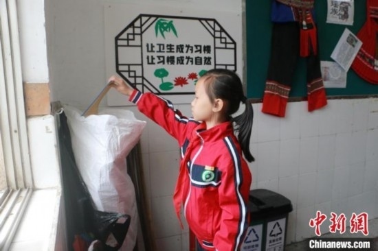 圖為學(xué)生將可回收物放置進(jìn)班級(jí)里的回收袋中。林馨攝