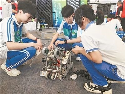 中學(xué)生在組裝機器人準備比賽。記者 陳曦攝