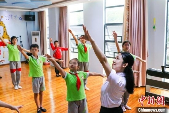 榮獲“廣東好人”稱號的姚蘊(yùn)儀11日在廣東汕頭市潮南區(qū)特殊教育學(xué)校教聽障孩子練習(xí)舞蹈。鐘欣 攝