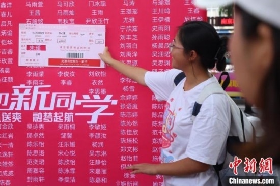 新生手持夢(mèng)想“機(jī)票”打卡新生名單墻。泱波 攝