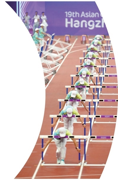 杭州奧體中心體育場內(nèi),志愿者在田徑項(xiàng)目女子七項(xiàng)全能100米欄比賽前準(zhǔn)備場地。 新華社記者 江文耀攝