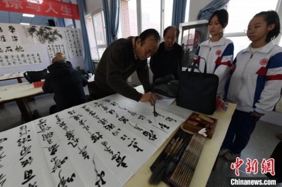 12月25日,書(shū)法家在蘭州交通大學(xué)附屬中學(xué)現(xiàn)場(chǎng)為學(xué)校題寫(xiě)了校名、校訓(xùn)、校風(fēng)、名言警句等。戴文昌 攝
