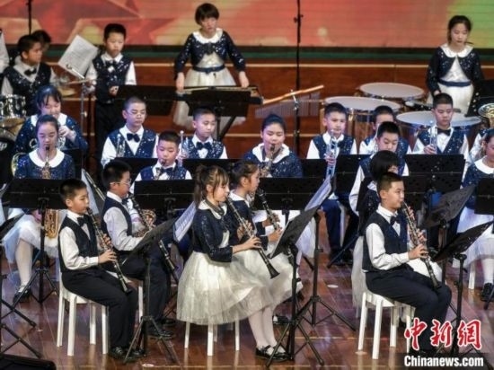 烏魯木齊市第27小學(xué)交響管樂團登臺獻藝。中新網(wǎng)記者 劉新 攝