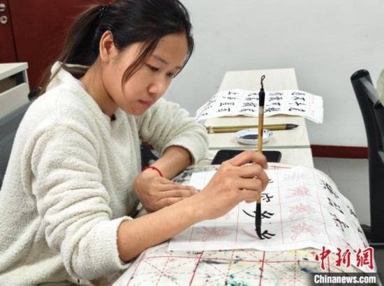 4月3日,在北京華文學(xué)院參加中文學(xué)習(xí)班的泰國(guó)學(xué)員吳嘉莉正在練習(xí)書(shū)法。(中新網(wǎng)記者韓輝 攝)