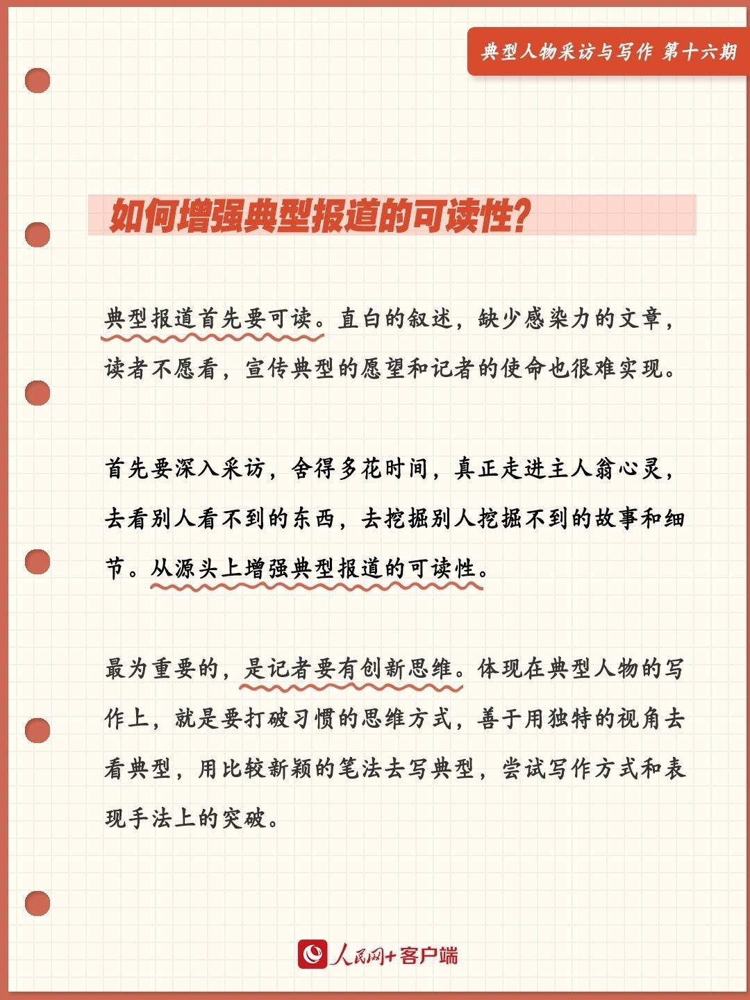 首先要深入采訪,舍得多花時(shí)間,真正走進(jìn)主人翁的心靈,去看別人看不到的東西,去挖掘別人挖掘不到的故事和細(xì)節(jié)。從源頭上增強(qiáng)典型報(bào)道的可讀性。