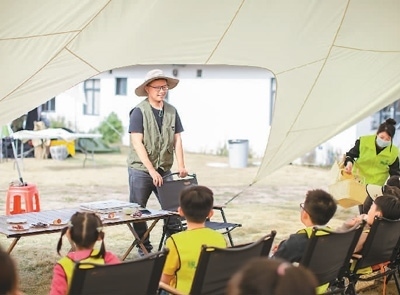 潘偉在“蔬東坡”農(nóng)場(chǎng)給參加研學(xué)活動(dòng)的孩子們做農(nóng)業(yè)知識(shí)科普。