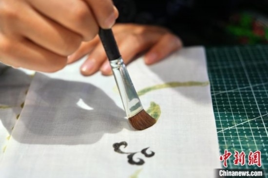 貴州織金苗族蠟染2021年6月入選國務(wù)院公布第五批國家級(jí)非物質(zhì)文化遺產(chǎn)代表性項(xiàng)目名錄?!?5后”苗族女孩王秋雨大學(xué)畢業(yè)后回到織金,成為一名織金苗族蠟染推廣者。她不僅使用傳統(tǒng)小臘刀,還使用大臘刀和毛筆,以蜂蠟為墨在絲巾、衣服、箱包上繪制小篆、甲骨文、山水等文字與圖案,這些蠟染產(chǎn)品深受消費(fèi)者喜愛。圖為6月19日,王秋雨在織金縣平遠(yuǎn)古鎮(zhèn)的依文織金數(shù)字化展廳制作蠟染。周燕玲 攝