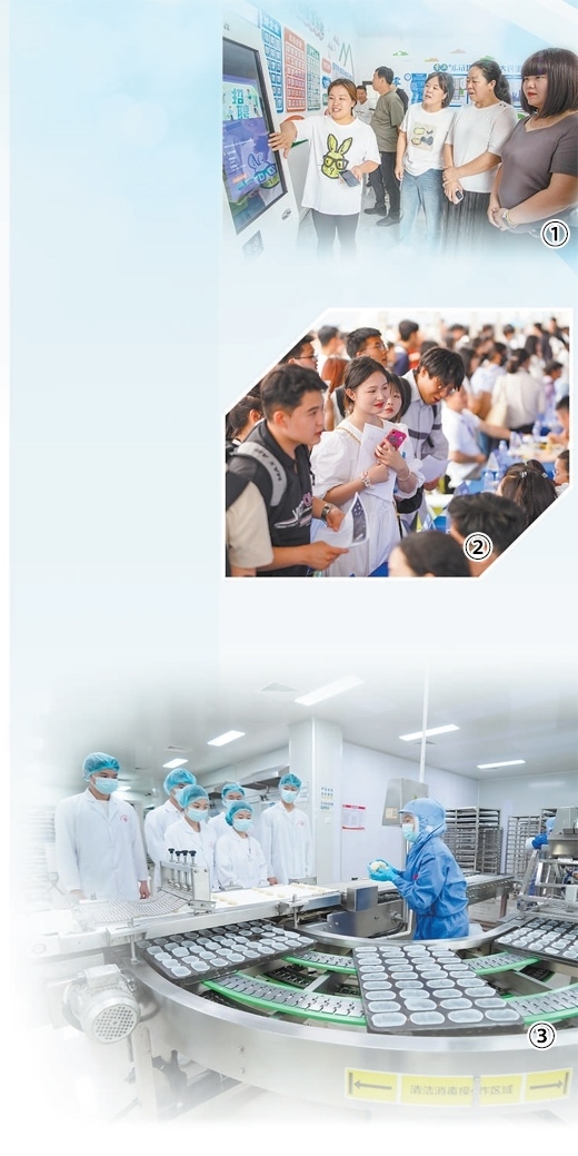 圖①:5月29日,河北邯鄲市復(fù)興區(qū)齊村居民在零工小站找工作。聶長青攝 圖②:6月2日,求職者在南昌大學(xué)參加高校畢業(yè)生雙選會。史港澤攝 圖③:日前,某職校學(xué)生在福建晉江市一家食品工廠參加實訓(xùn)。謝貴明攝