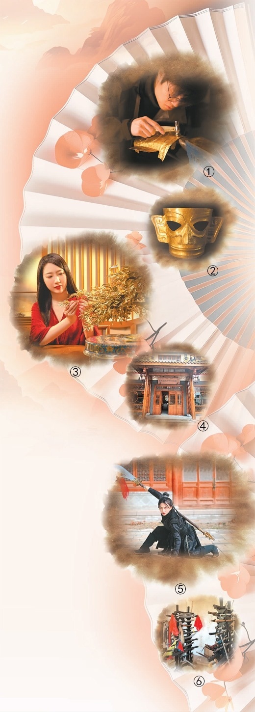 | 圖①:王莘閣在工作。圖②:王莘閣復刻的三星堆黃金面具。圖③:雁鴻展示她制作的工藝品。圖④:雁鴻國風研習技藝館。圖⑤:張含亮在進行武術視頻拍攝。圖⑥:張含亮拍攝用的兵器道具。本文照片由受訪者提供潘旭濤制圖 |