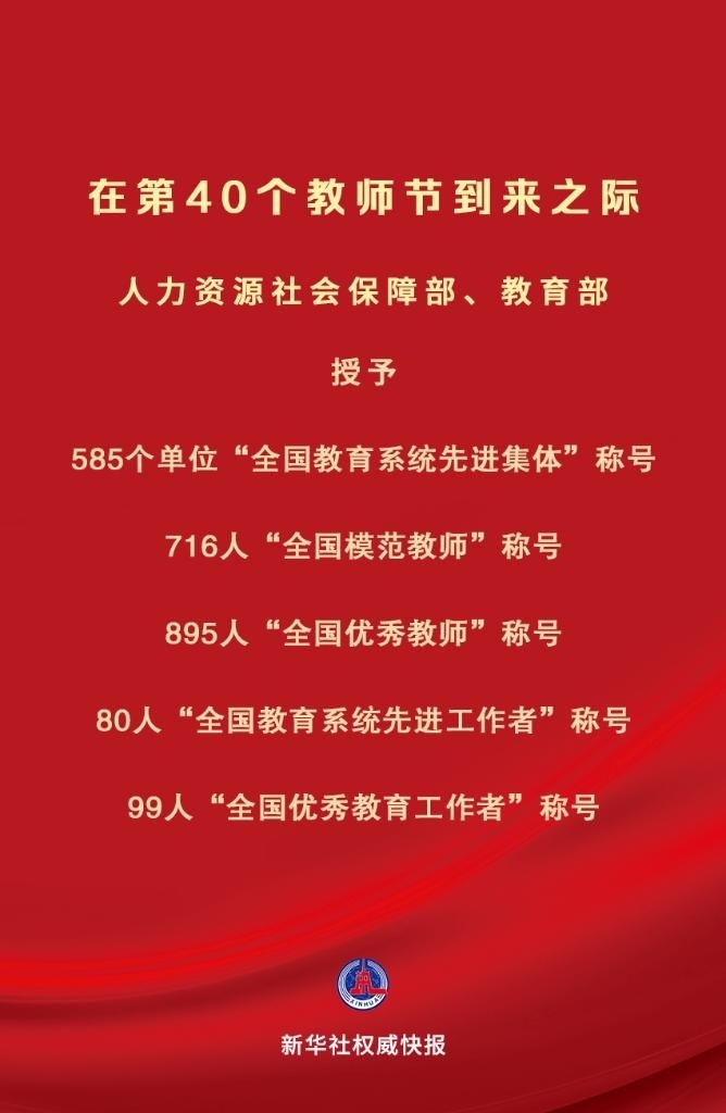在中華人民共和國成立75周年和第40個(gè)教師節(jié)到來之際,為大力弘揚(yáng)教育家精神,營造全社會(huì)尊師重教濃厚氛圍,激勵(lì)全國廣大教師和教育工作者落實(shí)立德樹人根本任務(wù),積極投身教育強(qiáng)國建設(shè),人力資源社會(huì)保障部、教育部決定授予中央財(cái)經(jīng)大學(xué)金融學(xué)院等585個(gè)單位“全國教育系統(tǒng)先進(jìn)集體”稱號(hào);授予刁榮春等716名同志“全國模范教師”稱號(hào);授予于淵等895名同志“全國優(yōu)秀教師”稱號(hào);授予王彥平等80名同志“全國教育系統(tǒng)先進(jìn)工作者”稱號(hào);授予王軍等99名同志“全國優(yōu)秀教育工作者”稱號(hào)。