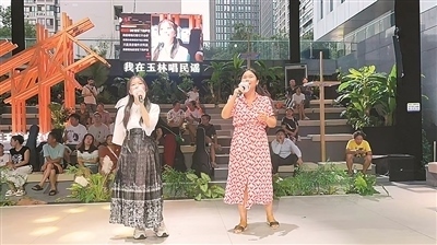 孫曉(左一)和營員在成都玉林路演唱。
