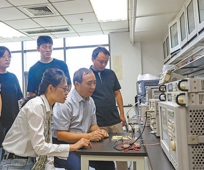 北京郵電大學(xué)多頻微波通信技術(shù)團(tuán)隊(duì)的劉元安教授(右二)指導(dǎo)學(xué)生開(kāi)展科研工作。唐玉嬋攝(人民視覺(jué))