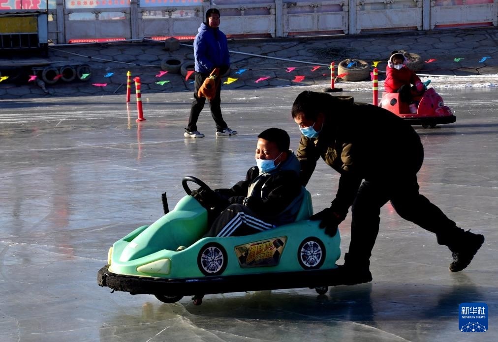 12月21日,人們在甘肅省酒泉市肅州區(qū)錦玉公園滑冰場嬉戲。