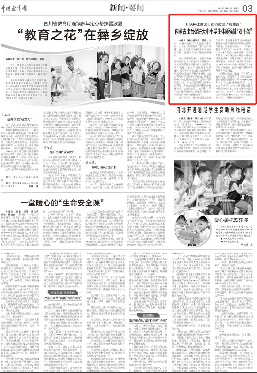 2025年7月11日,《中國教育報(bào)》第3版刊發(fā)題為《杜絕把體育課上成說教課、“放羊課”內(nèi)蒙古出臺(tái)促進(jìn)大中小學(xué)生體質(zhì)強(qiáng)健“雙十條”》的文章,報(bào)道了內(nèi)蒙古教育廳印發(fā)促進(jìn)中小學(xué)生、大學(xué)生體質(zhì)強(qiáng)健的“雙十條”措施,進(jìn)一步加強(qiáng)和改進(jìn)新時(shí)代學(xué)校體育工作,促進(jìn)學(xué)生身心健康全面發(fā)展。