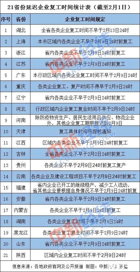 截至發(fā)稿時,湖南、廣東、上海、重慶、江蘇、浙江、河南、河北、山東、安徽、貴州、云南、福建、遼寧、內蒙古等19省份區(qū)域內企業(yè)復工時間不得早于2月9日24時,吉林不得早于2月2日24時,湖北不得早于2月13日24時。