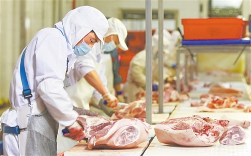 7月15日,北京二商肉類食品集團有限公司員工在肉類分割流水線上工作。新華社記者 李欣 攝