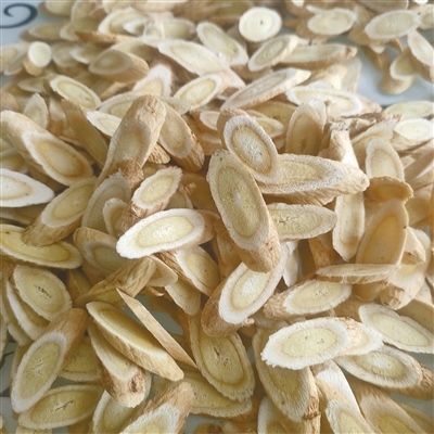 農(nóng)戶將黃芪切片裝袋后銷售。