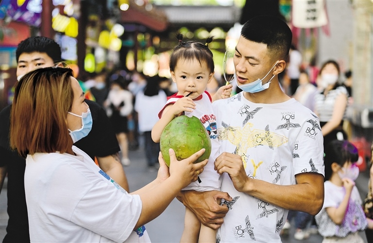 6月18日,呼和浩特市民在玉泉區(qū)通順大巷小吃街上品嘗椰子汁。當(dāng)日,2022年塞上老街音樂美食季在呼和浩特市玉泉區(qū)開幕。今年的音樂美食季活動共分為阿拉坦汗廣場、大召前街等六大活動區(qū)塊,推出啤酒節(jié)、美食季、快閃店、后備箱集市等八大主題活動,助力首府夜經(jīng)濟(jì)發(fā)展、夜消費(fèi)繁榮,活動將持續(xù)到9月底。(記者 王磊 攝)