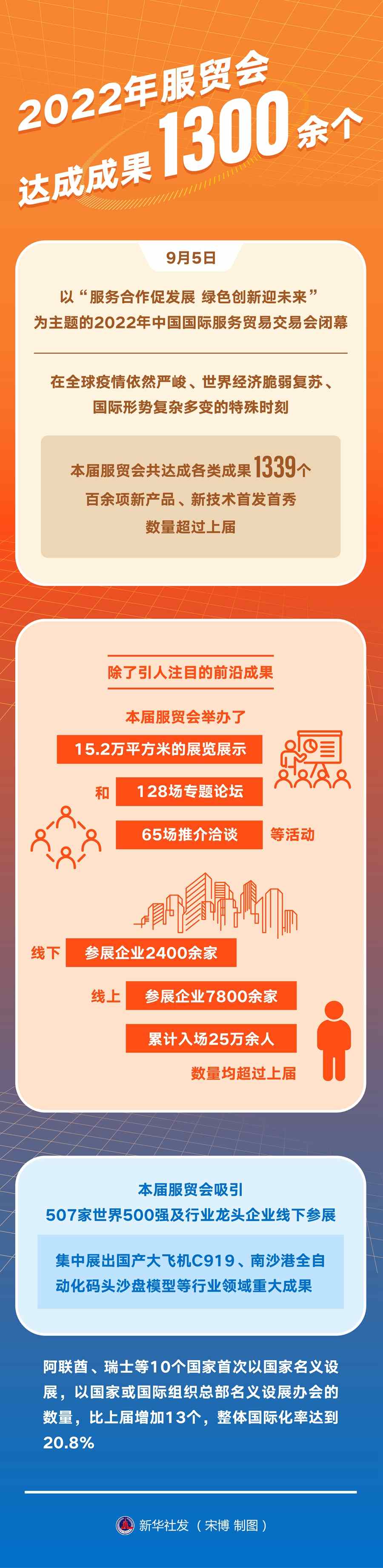 9月5日,以“服務合作促發(fā)展綠色創(chuàng)新迎未來”為主題的2022年中國國際服務貿(mào)易交易會閉幕。在全球疫情依然嚴峻、世界經(jīng)濟脆弱復蘇、國際形勢復雜多變的特殊時刻,本屆服貿(mào)會共達成各類成果1339個,百余項新產(chǎn)品、新技術首發(fā)首秀,數(shù)量超過上屆。